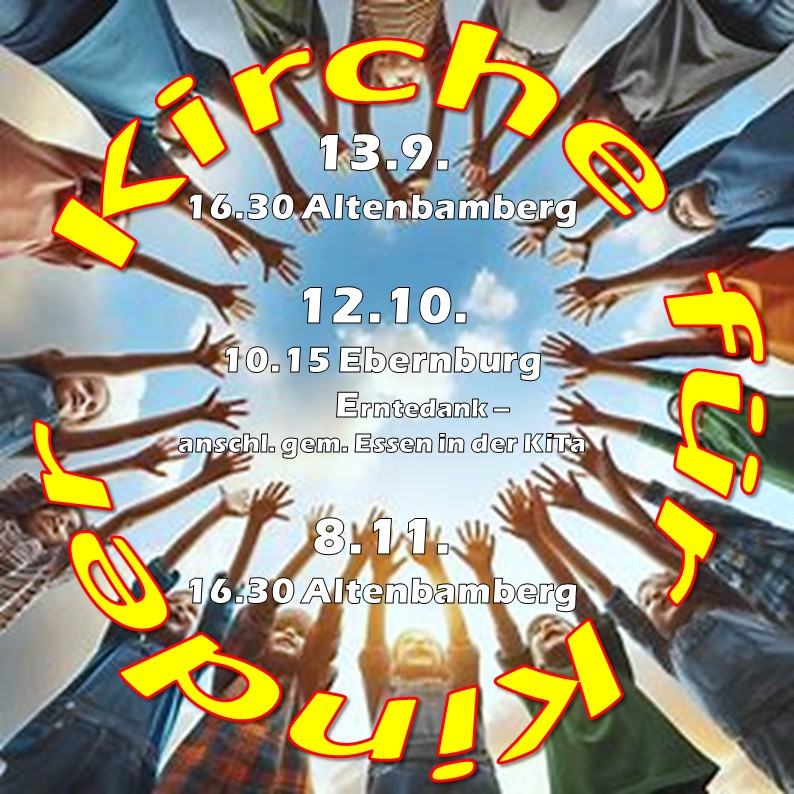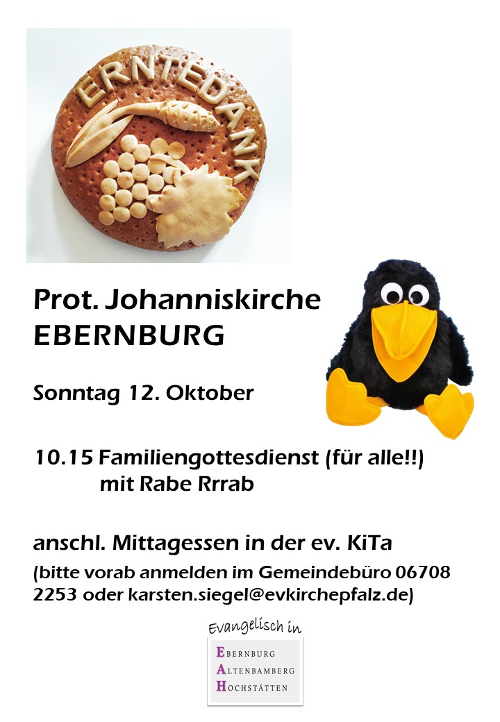 - Ebernburg am 12.10. um 10.15 – Ein Familiengottesdienst, zu dem nicht nur Menschen mit Kindern eingeladen sind, sondern ausdrücklich ALLE. Im Anschluss gibt es in der KiTa ein gemeinsames Suppen-Essen (bitte vorab anmelden über das Gemeindebüro)